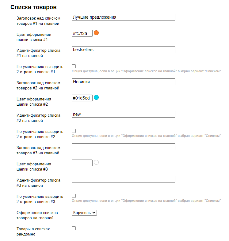 В теме доступен вывод до 3-х списков. Для каждого списка можно указать заголовок и цвет фона заголовка. Настройки находятся в разделе Главная страница/Списки товаров: