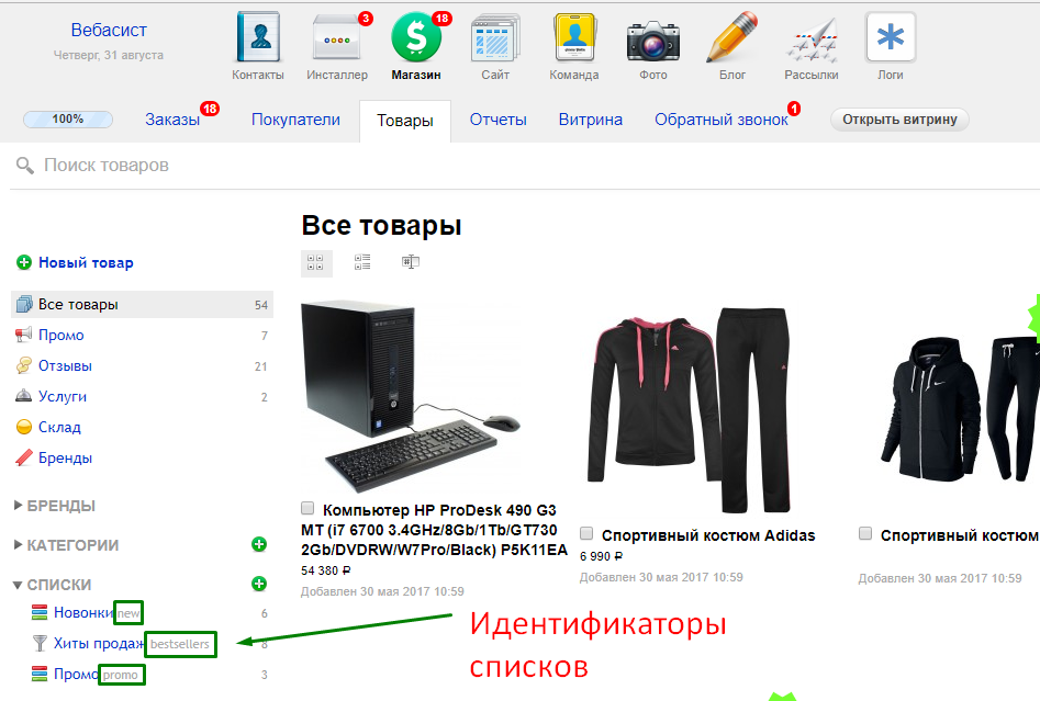 Чтобы определить идентификатор списка для настройки "Идентификатор списка #1", необходимо зайти в приложение Магазин - Товары - Списки:
