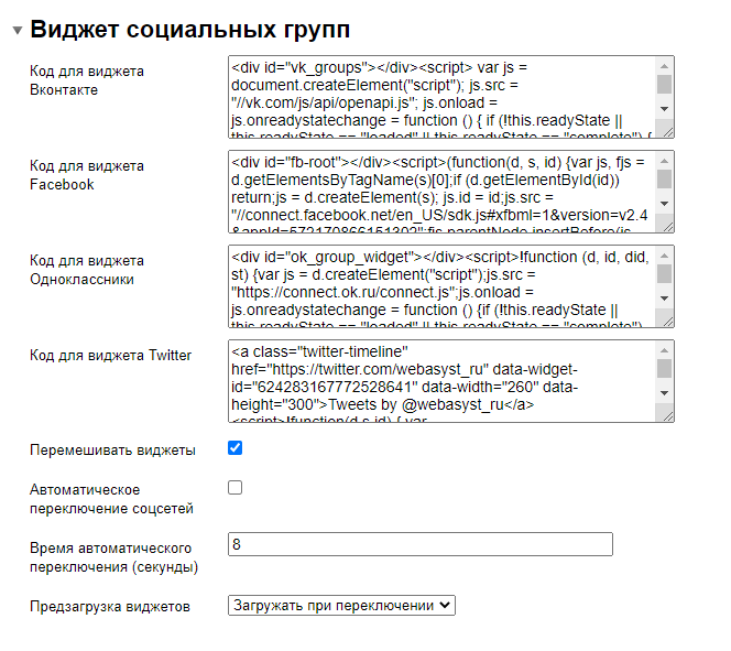 - Код для виджета Twitter. В данной поле вставляется код группы Twitter. Получить код для вставки можно на странице.