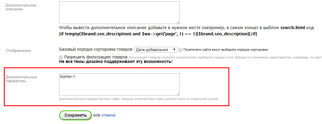 2) Указать Дополнительный параметр home=1 в настройках бренда