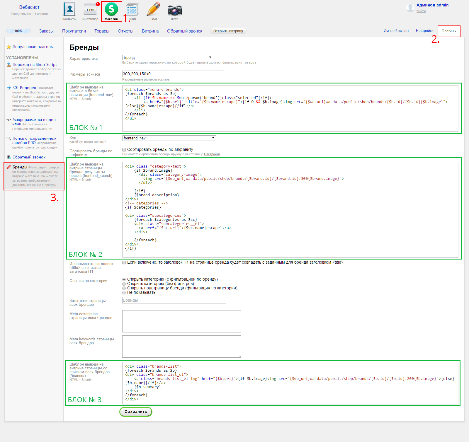 Ссылка на плагин в магазине Webasyst (приобретается отдельно)