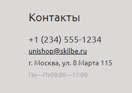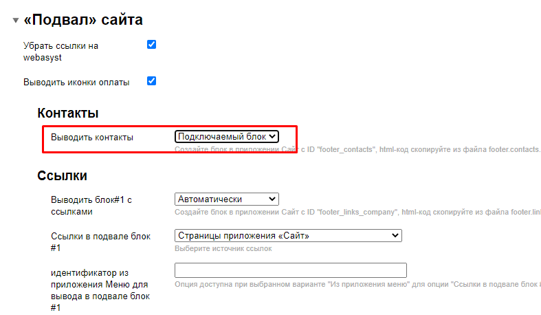 4) Если вам необходимо отредактировать html-код в блоке с адресом или в блоке с телефоном, то в разделе Подвал сайта переключите опцию Выводить контакты на вариант "Подключаемый блок":