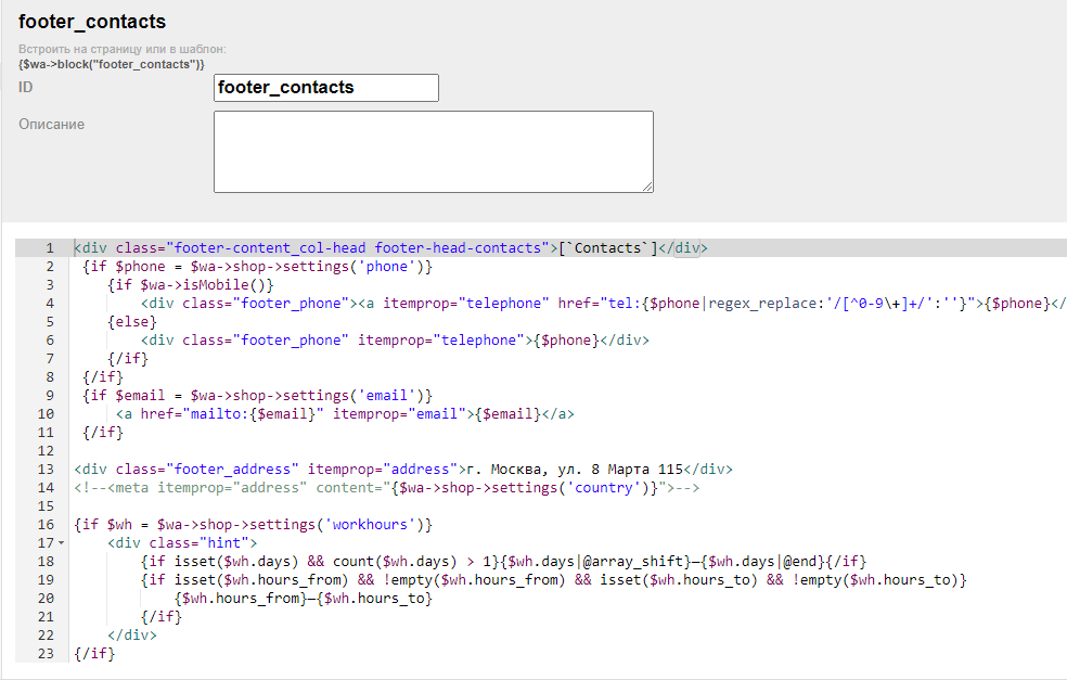 Далее, перейдите с приложение Сайт -> Блоки, создайте блок с ID footer_contacts и скопируйте в содержимое код из файла footer.contacts.html (приложение Сайт - Дизайн - Шаблоны):