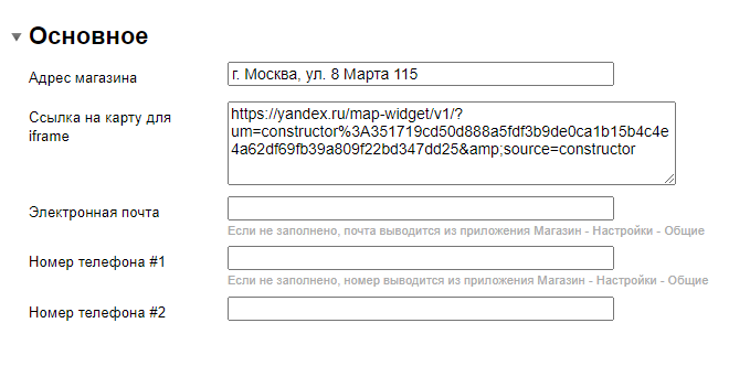 2) Если электронная почта и первый номер телефона не заполнены то данные выводятся из приложения Магазин - Настройки - Общее: