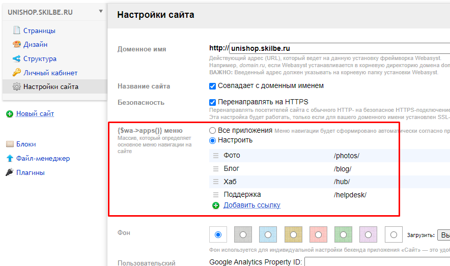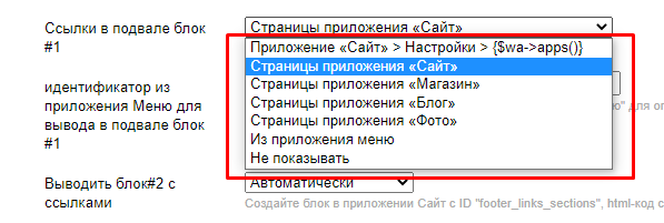 3) Ссылки из настроек сайта (вариант "Приложение «Сайт» > Настройки > {$wa->apps()}") формируется в приложении Сайт - Настройки сайта: