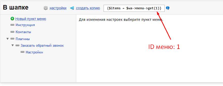 4) При выбранном варианте "из приложения меню", необходима установка приложения Управление меню и заполнение опции "идентификатор из приложения Меню для вывода в верхнем меню". ID меню можно узнать в приложении Управление меню, на странице редактирования меню: