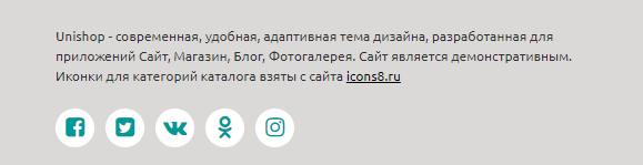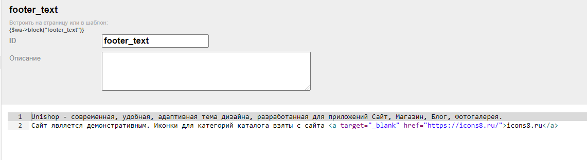 Текст о компании Для вывода текста в подвале перейдите в приложение Сайт - Блоке, создайте блок с ID footer_text с нужным текстом: