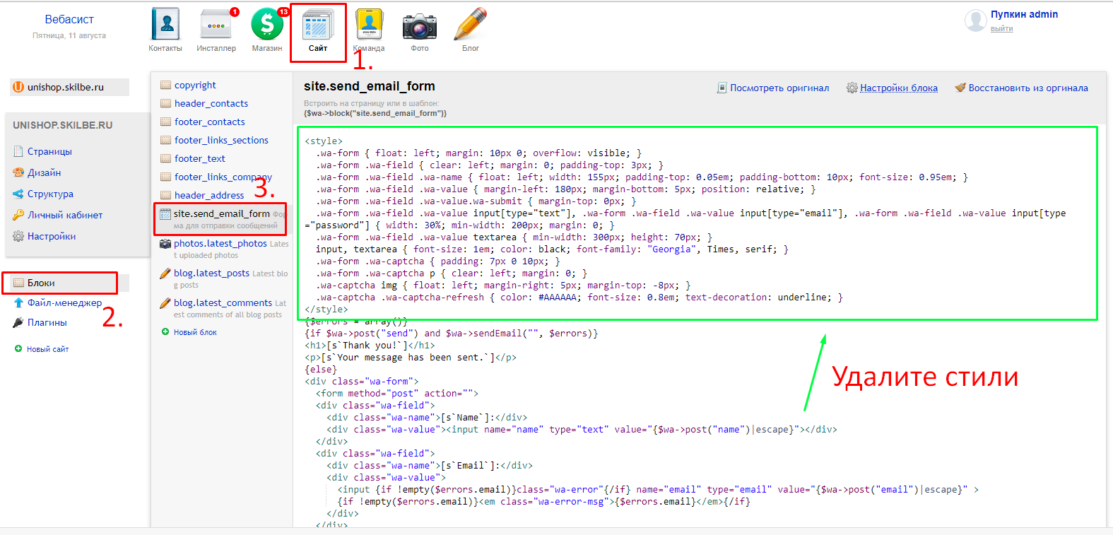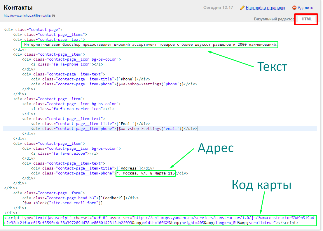 1. Скопируйте html-код в редактируемую страницу из файла , отредактируйте текст, заменив код карты: