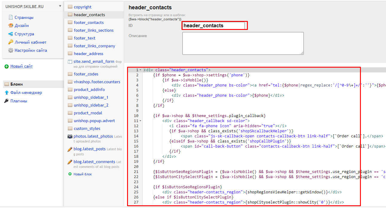 4) Если вам необходимо отредактировать html-код в блоке с адресом или в блоке с телефоном, то в разделе Шапка сайта/Блоки в шапке переключите опции Блок с адресом и Блок с телефоном на вариант "Подключаемый блок":