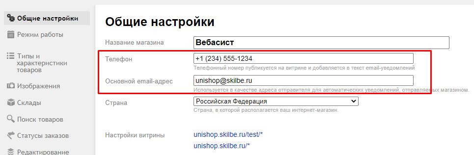 1) Контактные данные сайта заполняются во вкладке Основное: