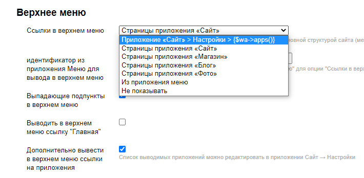 1) Настройки верхнего меню находятся в разделе Шапка сайте/Верхнее меню. Источником ссылок могут быть страницы приложений Сайт, Магазин, Блог, Фотогралерея, меню из настроек сайта, а так же меню из приложения Управления меню: